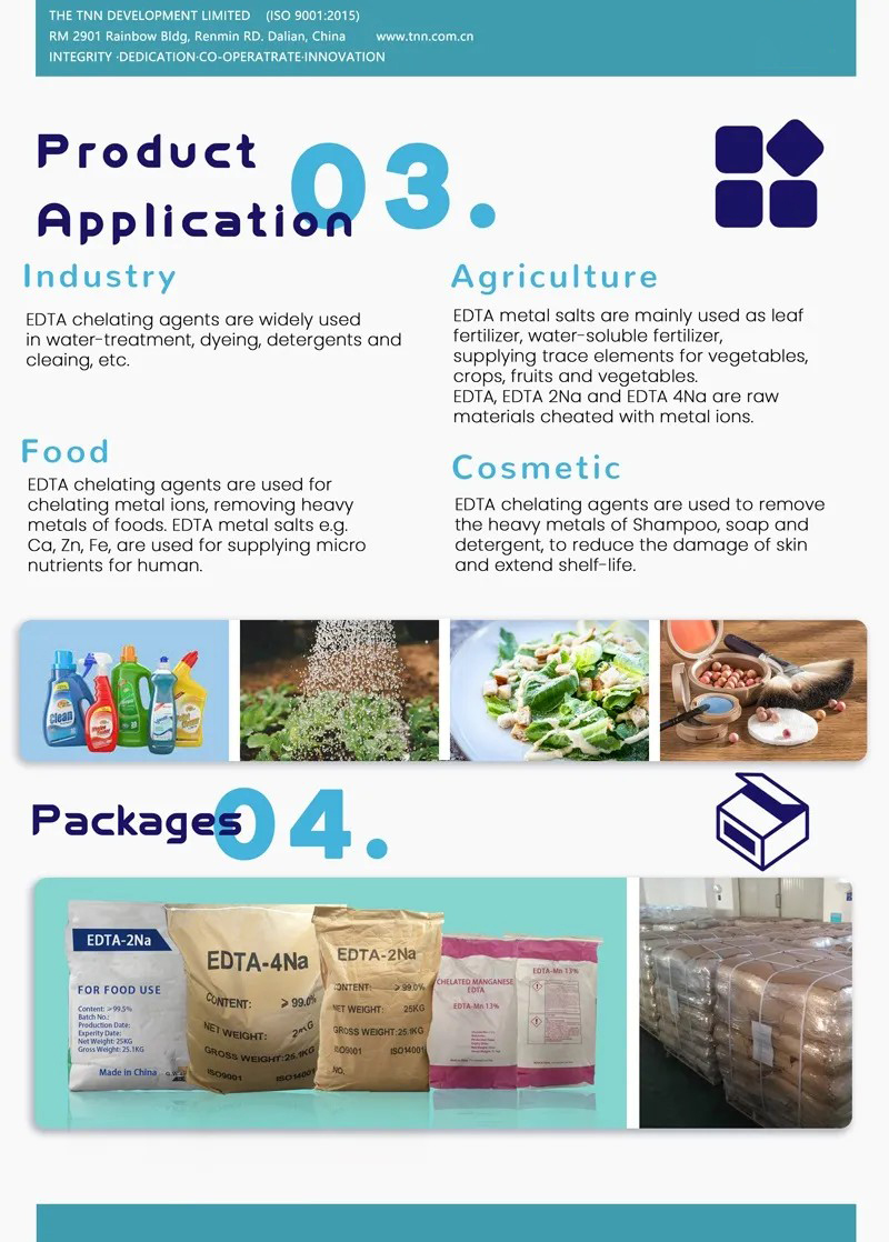 3.EDTA mainly used in adhesives, fiber winding, laminates, high-performance coatings, and tank lining coatings, as a curing agent for epoxy resins and a chain extender for polyurethane monome.