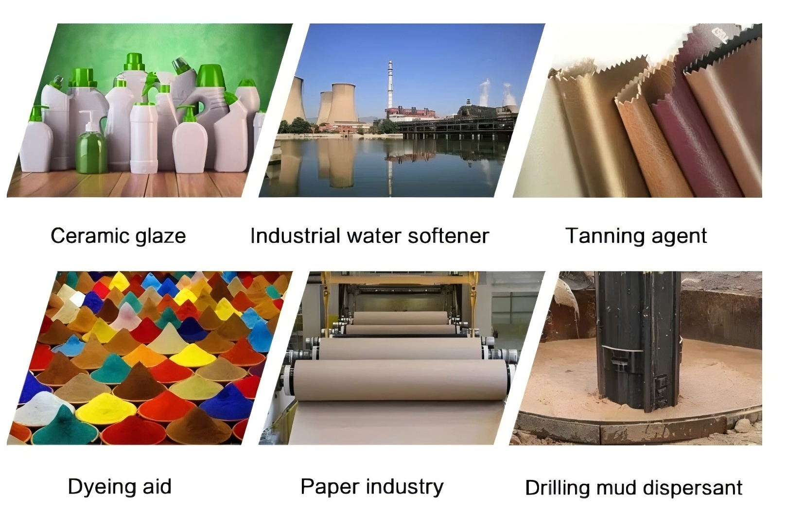 It can used as a water softener,  fabric weight agent, fire retardant, and is used to glaze, solder medicine, pharmaceuticals, paints, food industry and manufacturing ,water treatment agent, printing and dyeing detergent, quality improver , neutralizer, antibiotics train agents, biological and chemical treatment agent of food  quality improver.