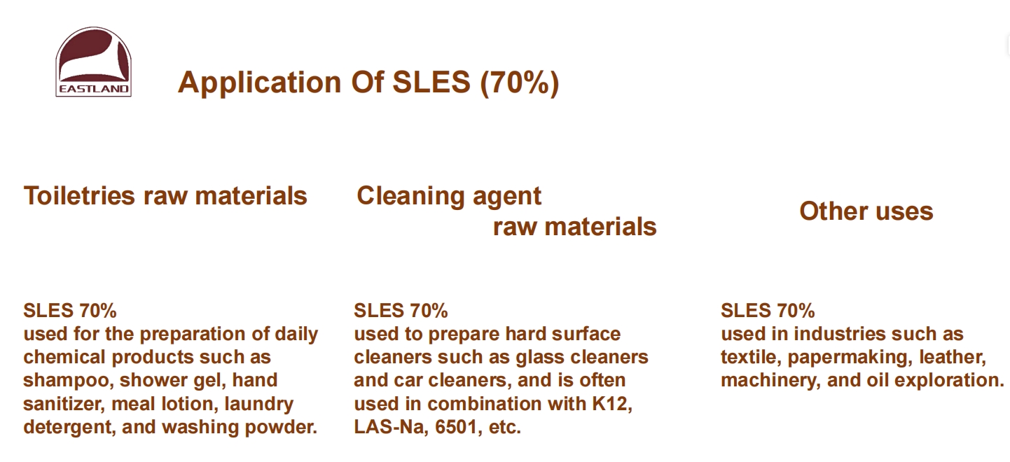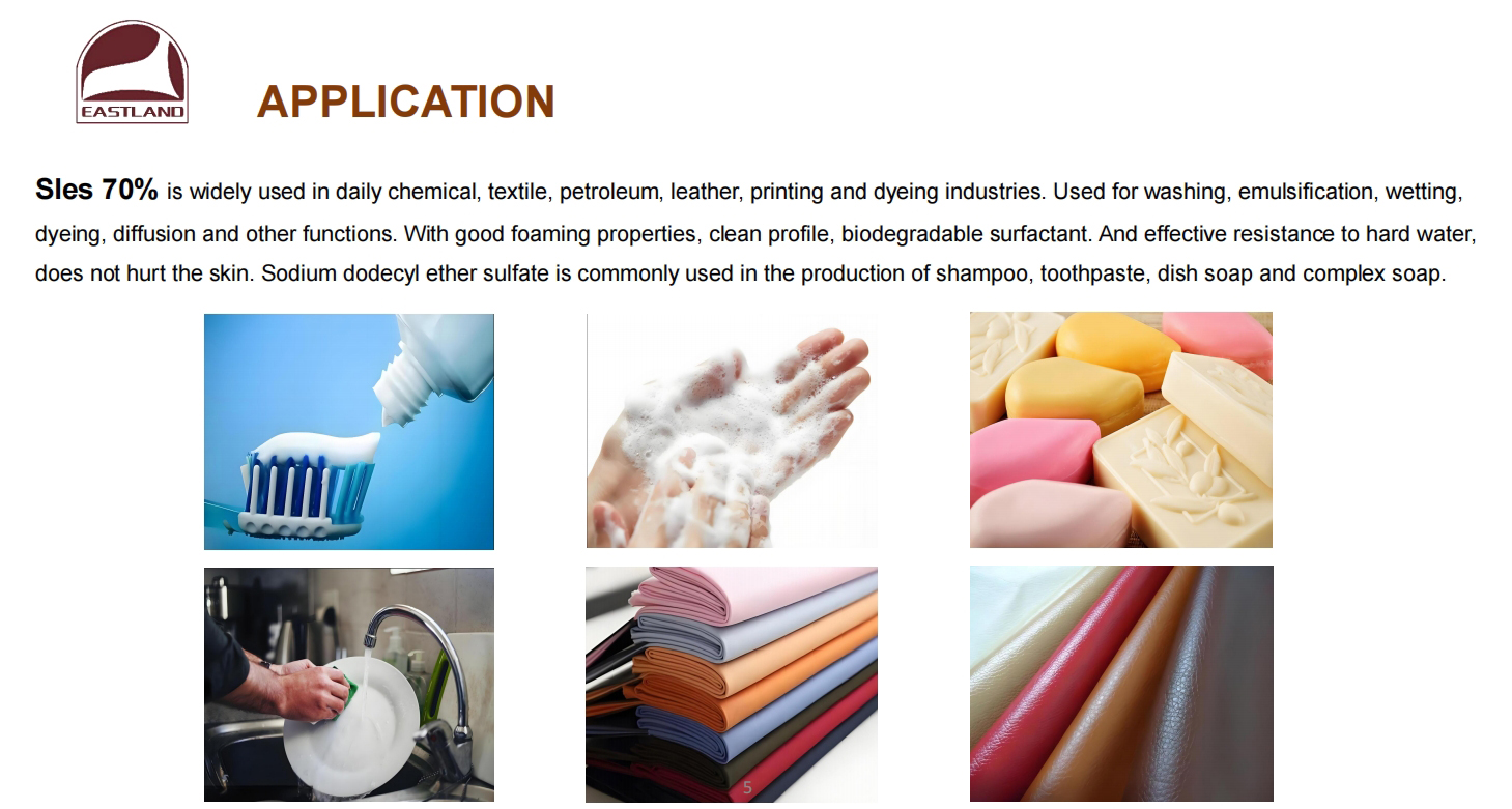 Sles 70% is widely used in daily chemical, textile, petroleum, leather, printing and dyeing industries. Used for washing, emulsification, wetting, dyeing, diffusion and other functions. With good foaming properties, clean profile, biodegradable surfactant. And effective resistance to hard water, does not hurt the skin. Sodium dodecyl ether sulfate is commonly used in the production of shampoo, toothpaste, dish soap and complex soap.