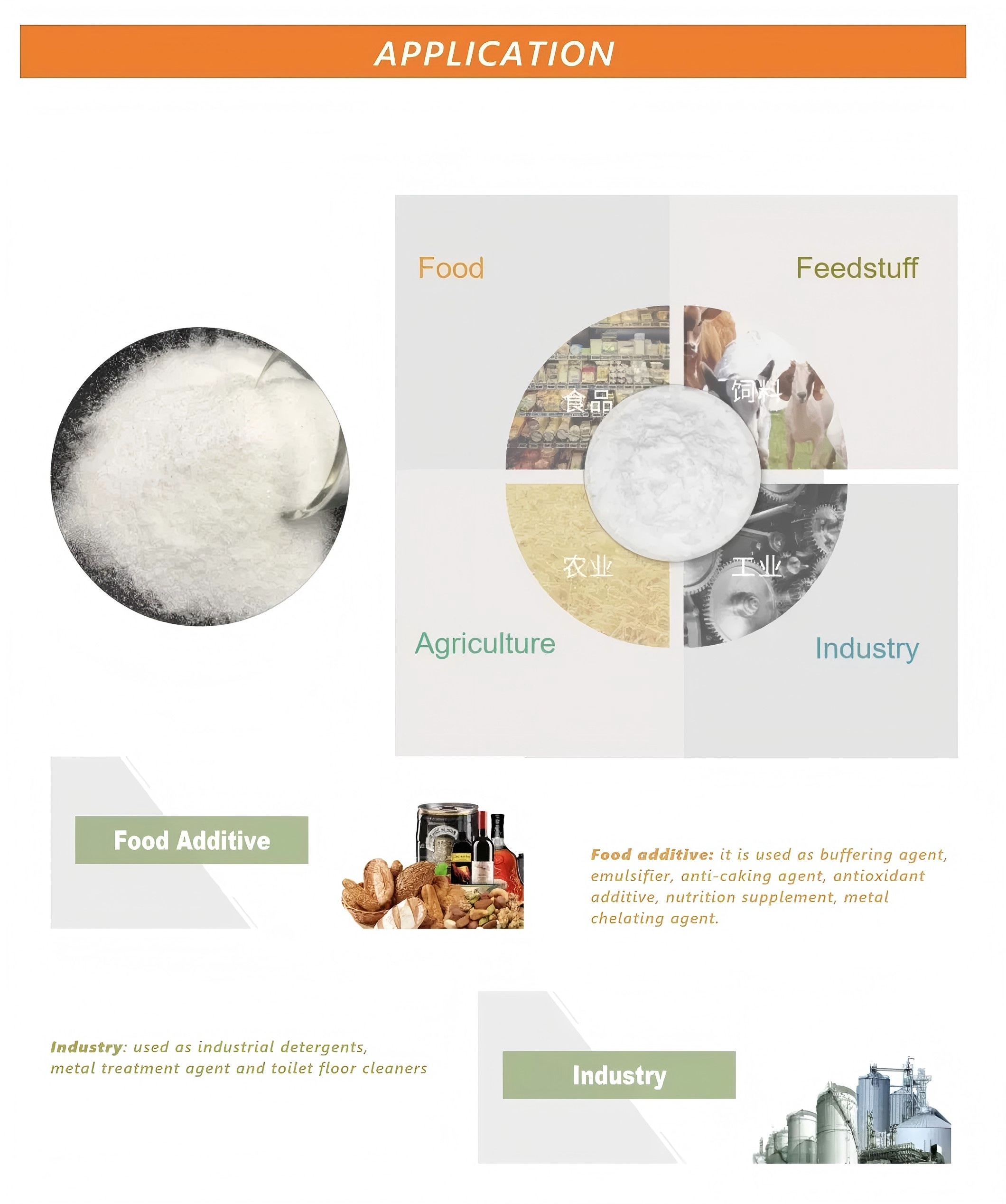 In detai,It could be used as a boiler anti-scale agent, a PH Value buffer agent for the adhesive agent of wax paper; a color fixing agent in the printing and dyeing; a silk enhancing agent for the fabric, and line anti-embrittling agent . In the metallurgical industry ,used for chemical oil removal, decontamination.And it could be prompter of photographic development solution as well as teeth cleaner and bottle cleaner.